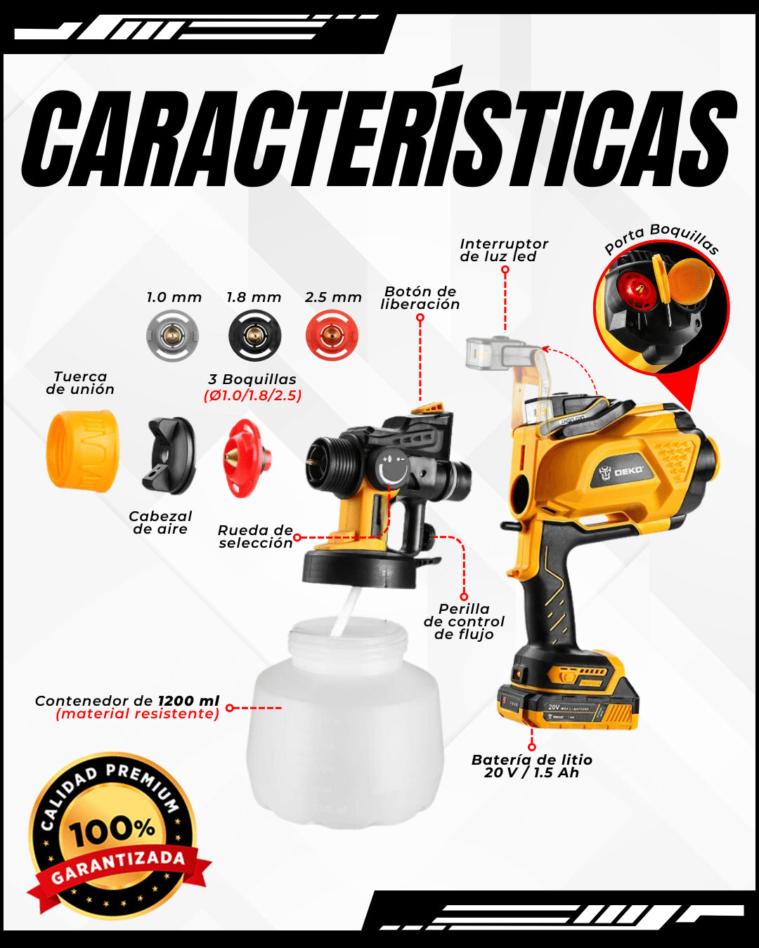 Optimiza y termina tus proyecto fácil y rápido, con nuestra Pistola de Pintura, con luz LED, Fácil de transportar e inalámbrica de alta potencia, y gran capacidad, 3 boquillas, HVLP, pulverización fácil, 1200 ml + obsequio.